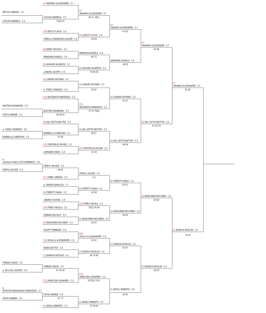 Nella prima semifinale di questa mattina Bianchi ha dimostrato di avere buone carte da giocarsi domani contro il favorito Ingarao. Dall’altra parte della rete c’era l’ottimo Mascarini. Ma il giocatore tesserato per il Three brothers pharaon di Reggio Calabria non si è mai perso d’animo nei momenti più delicati del match. Emblematico il finale del primo set: sangue freddo e campo “disegnato” benissimo anche nei momenti più caldi per arrivare al 7-5. Meno complicata, ma comunque dura, la seconda frazione: 6-3.