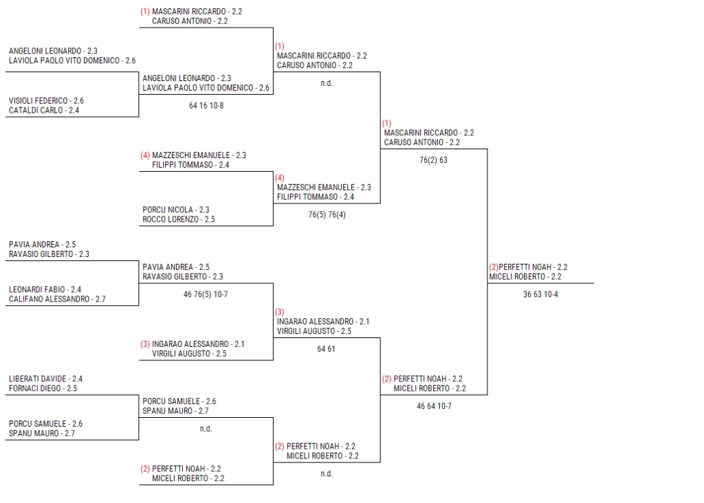 Il primo scudetto del torneo è stato consegnato: Roberto Miceli e Noah Perfetti hanno vinto la finale del doppio contro Antonio Caruso e Riccardo Mascarini. In una partita spettacolare hanno iniziato bene Caruso e Mascarini, 6-3 al primo set. Poi è cominciata la rimonta del duo Miceli-Perfetti: subito restituito il 6-3 iniziale. Quindi il super tie-break, un po’ un riassunto dei primi due set. Mascarini-Caruso in vantaggio 3-2. Poi un’ace di Perfetti cambia al partita. Da lì in poi sei punti consecutivi per la coppa emiliano-laziale. E scudetto vinto grazie al 10-4 conclusivo.
