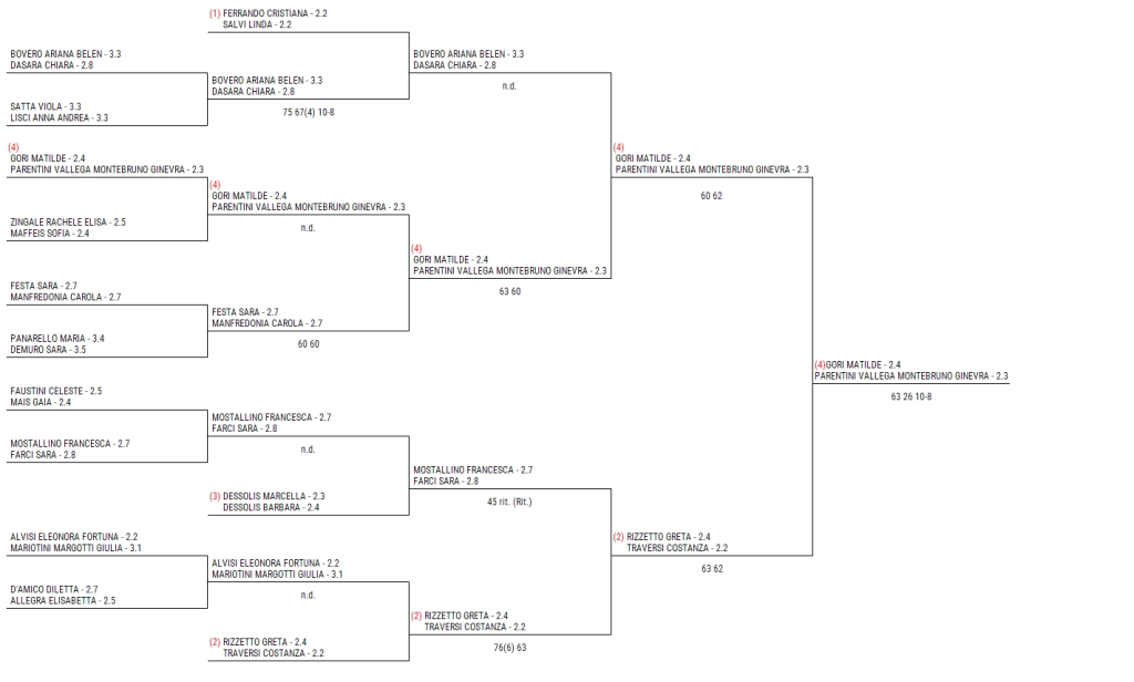 Nel doppio femminile, invece, il titolo e il pass per Roma sono andati a Matilde Gori e Ginevra Parentini, che in finale hanno superato Greta Rizzetto e Costanza Traversi per 6-3 2-6 10/8.