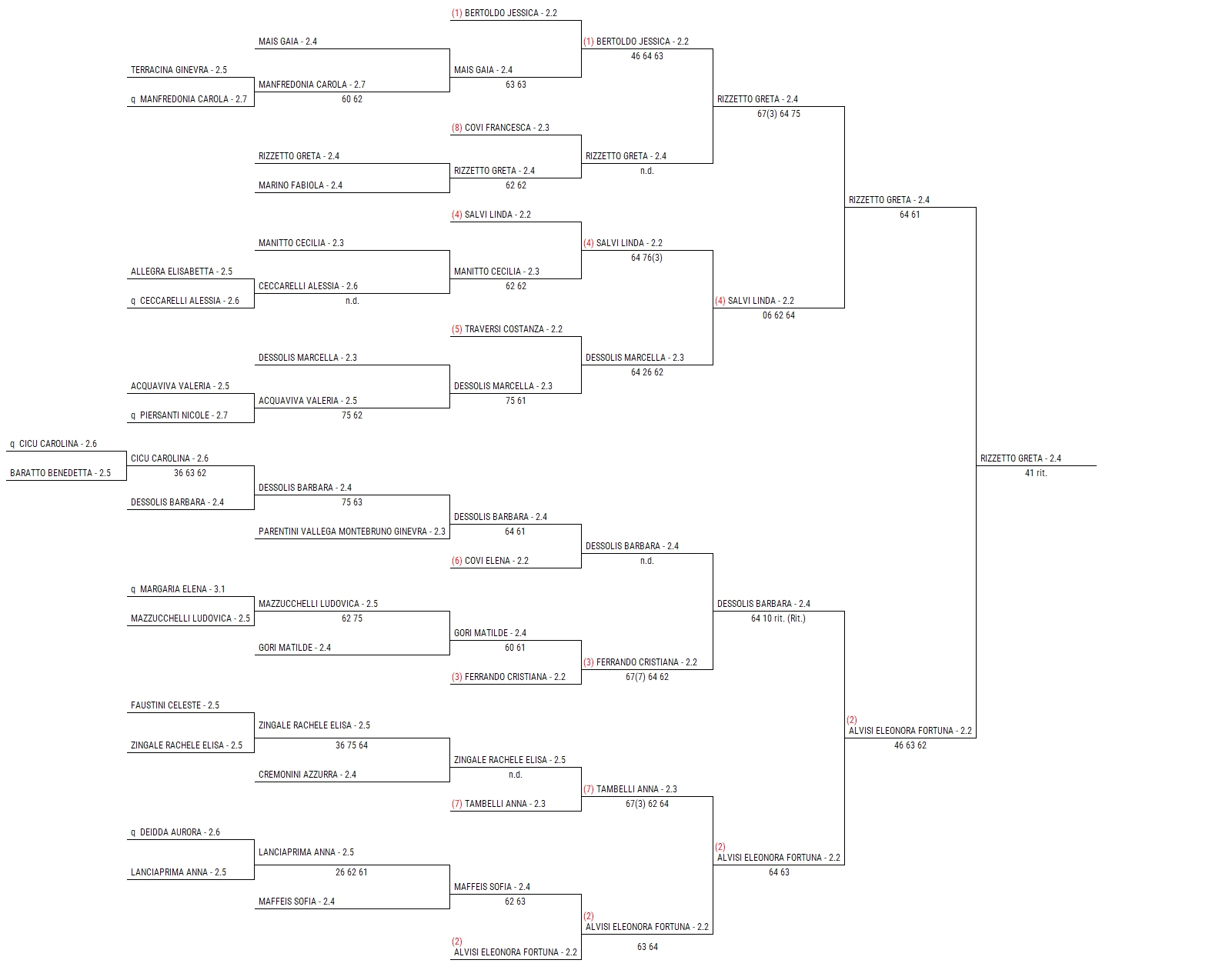 Prima di Ingarao, a gioire sui campi del Tennis Club Cagliari è toccato alla piemontese Greta Rizzetto, campionessa in un tabellone femminile che non la vedeva compresa fra le teste di serie. Ma le più forti le ha eliminate quasi tutte lei, battendo nei quarti di finale la numero 1 del seeding Jessica Bertoldo, in semifinale la numero 4 Linda Salvi e in finale la seconda favorita della vigilia Eleonora Alvisi, costretta a gettare la spugna dopo soli cinque giochi, in svantaggio per 4-1, a causa di un forte dolore all’adduttore. Si sono ben comportate le sorelle Dessolis: Marcella (2.3) è arrivata sino ai quarti battura solo al terzo set da Linda Salvi (2.2) mentre Barbara ha ceduto in semifinale a Eleonora Alvisi, sempre al terzo set.